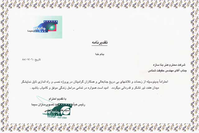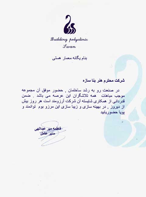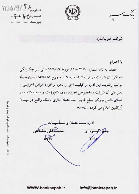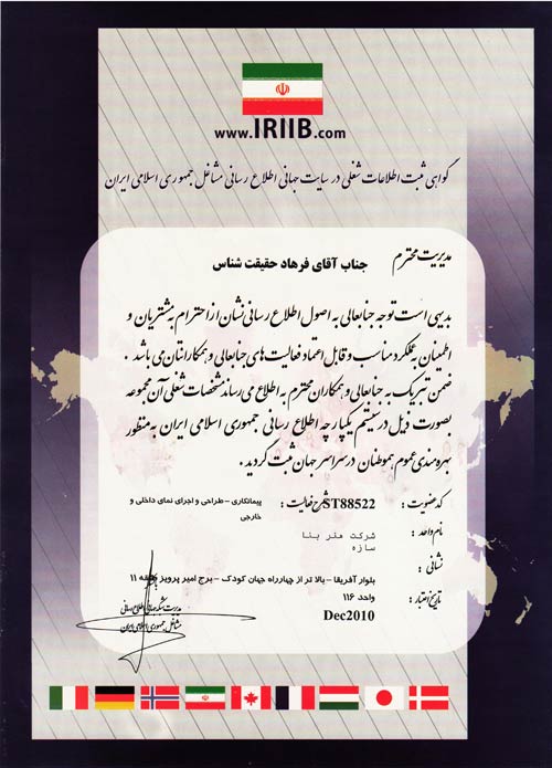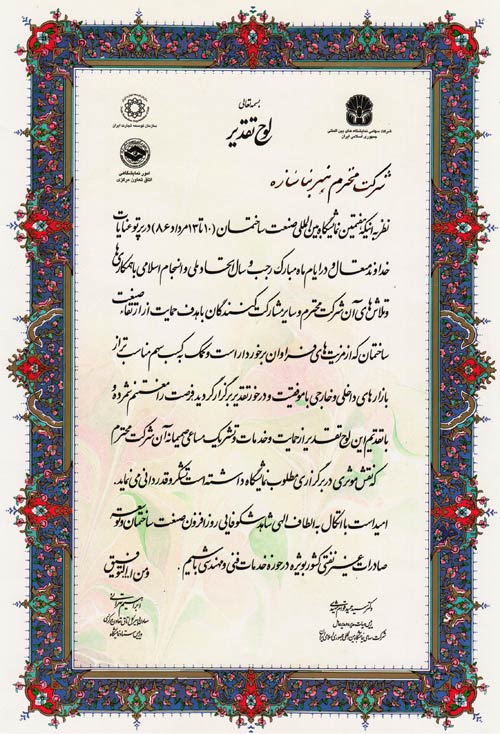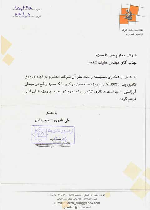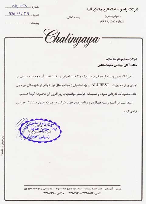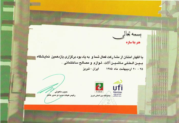 شرکت هنر بنا سازه مفتخر به دریافت گواهینامه ها و تقدیرنامه های متعدد در زمینه های گوناگون به شرح زیر شده است.